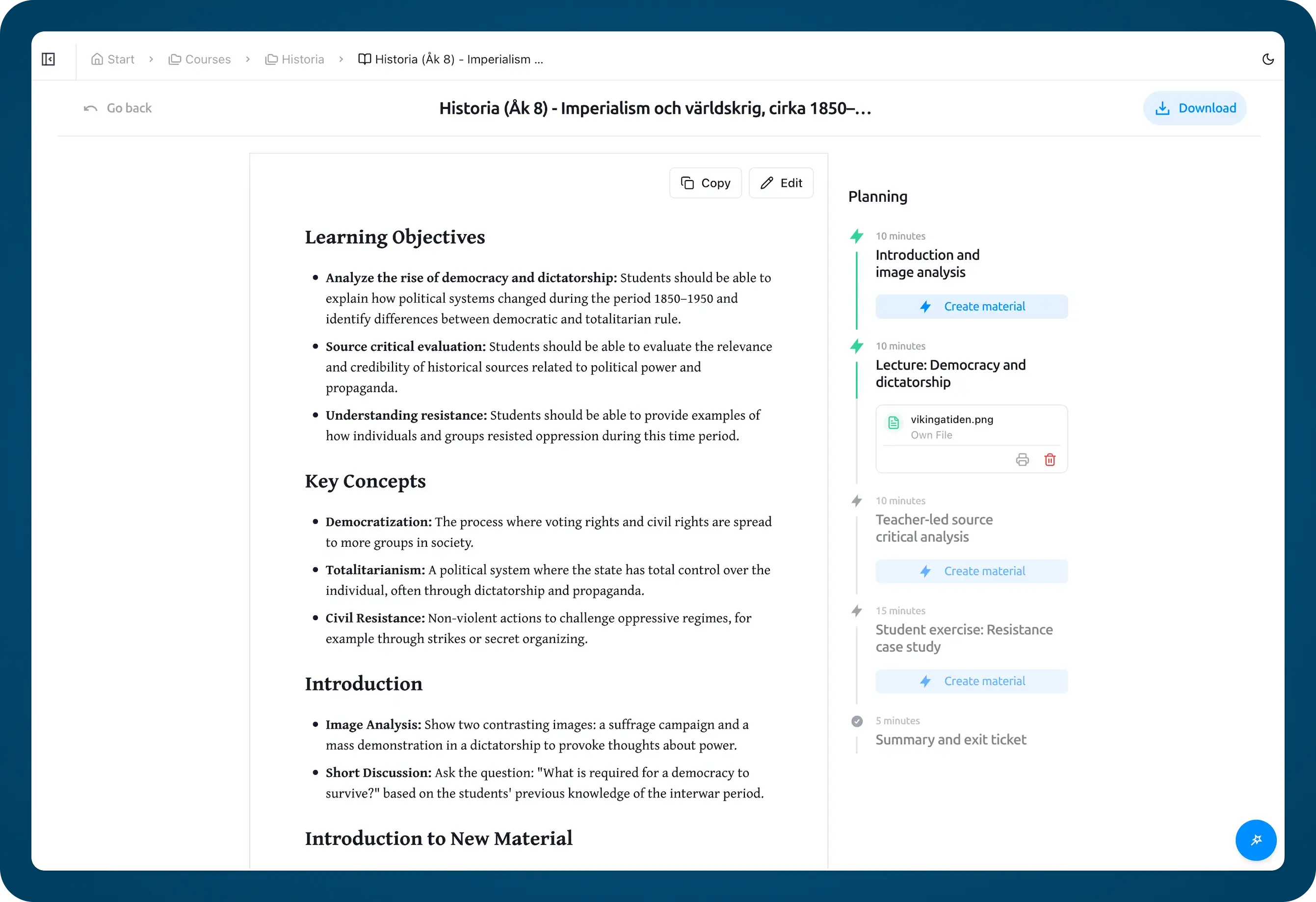 No prompting. No configuring dropdowns for every single generation. No describing your lesson from scratch every Monday morning. The AI understands the context of your courses and your students, and it uses that context every time, so each plan builds on what came before.