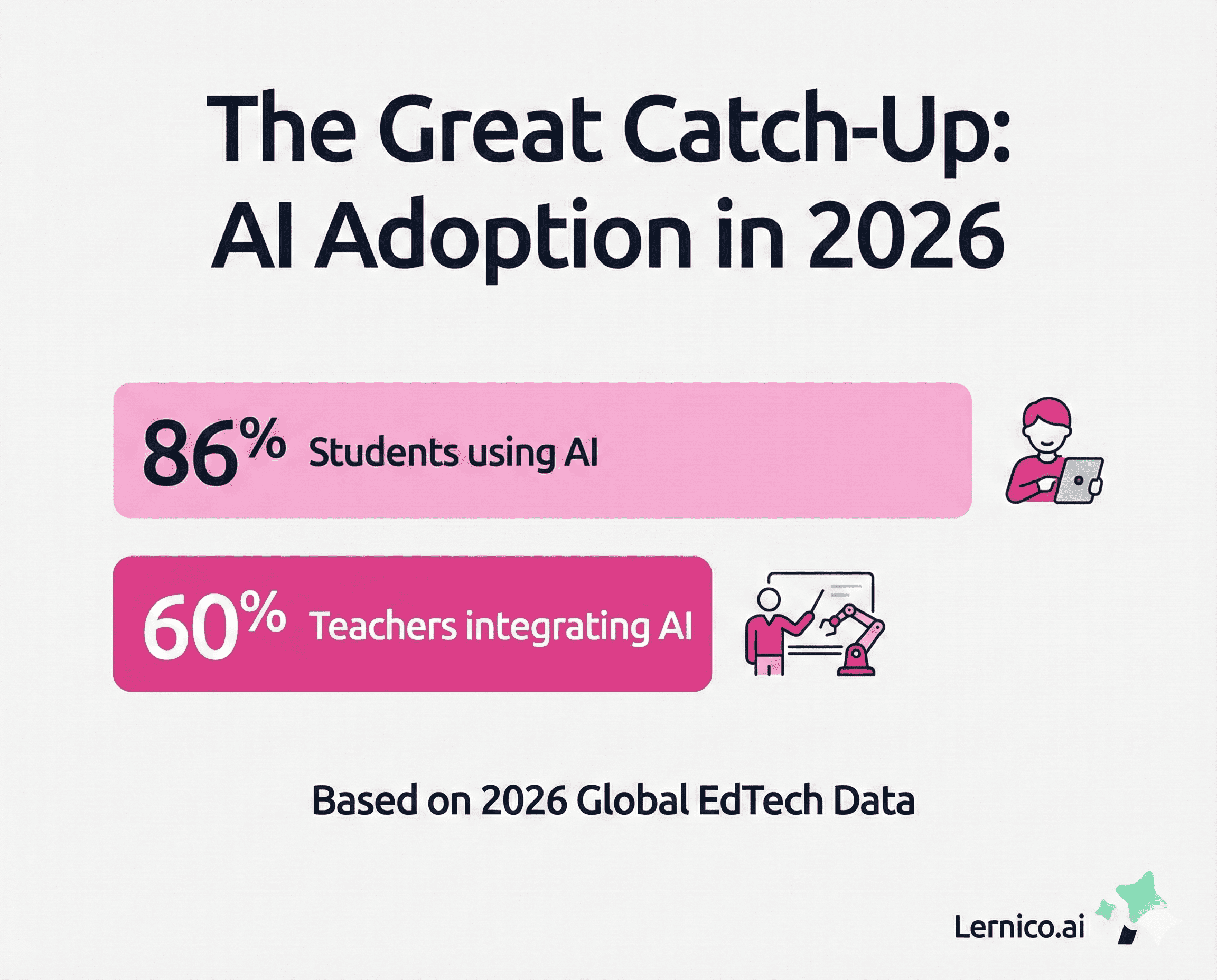 That nearly 9 out of 10 students use AI is no longer news—it is infrastructure. The headline for 2026 is that 60% of teachers now integrate AI regularly into their workflow, a sharp increase from previous years. We are witnessing a shift from "the student is cheating with AI" to "the teacher is planning with AI."